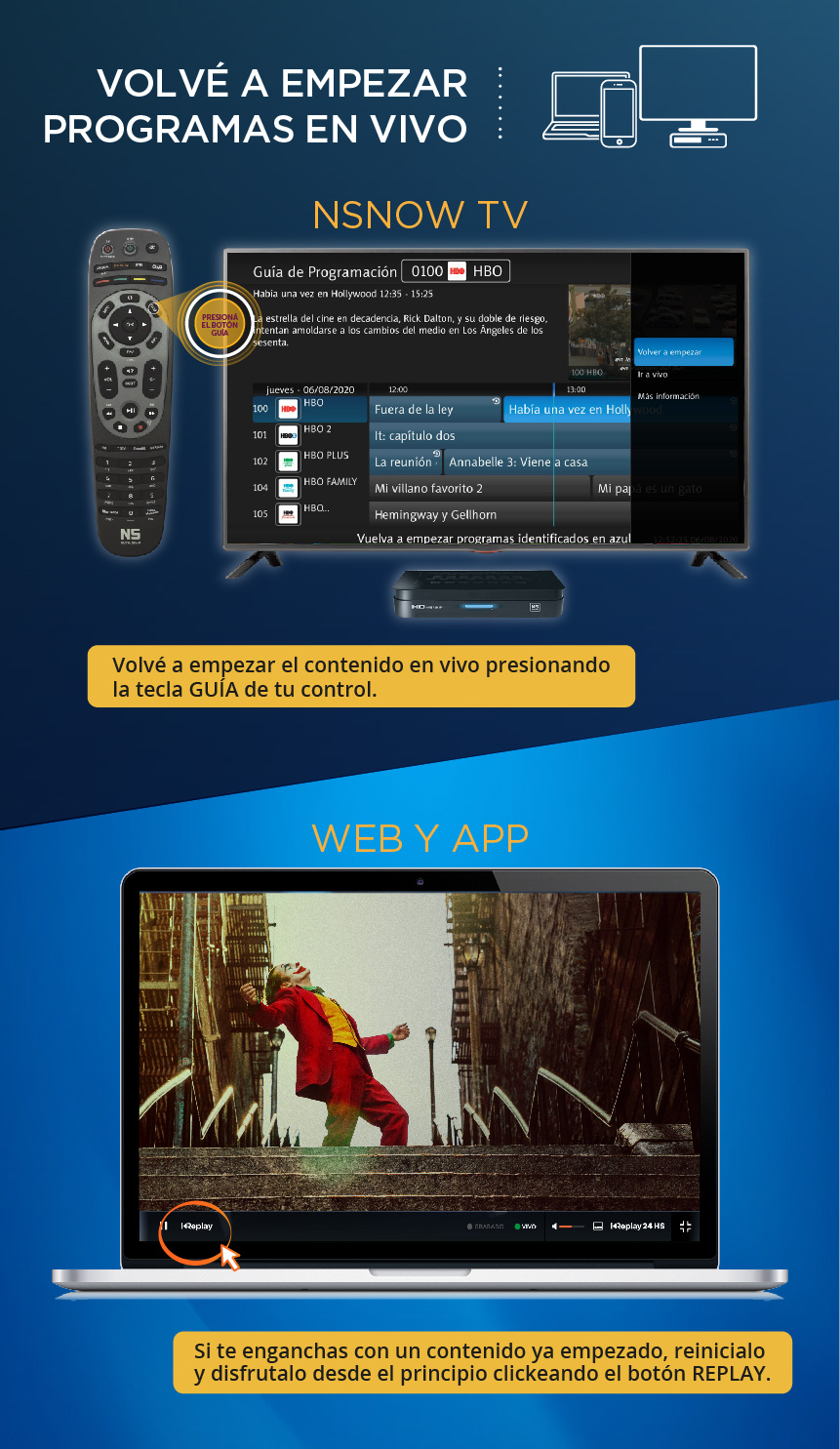 REPLAY es la funcionalidad de NSNOW que te permite reiniciar un contenido de una señal de TV. El cliente puede hacer REPLAY sobre todos los contenidos en vivo de todas las señales que tenga disponibles, de acuerdo a sus paquetes contratados, tanto en la web como en la app de NSNOW.